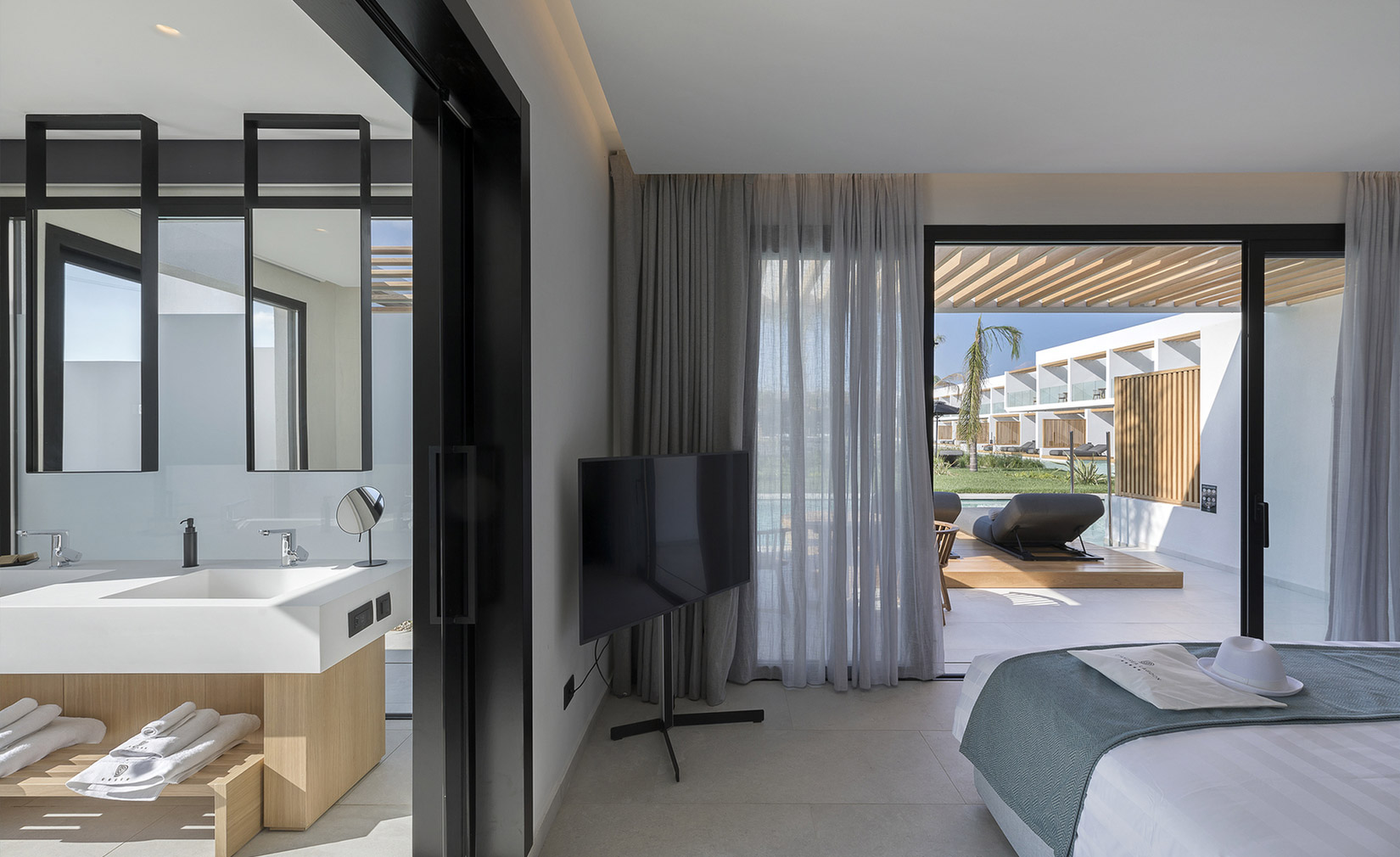 Die bodenlangen Fenster durchziehen die Wände des Schlaf- und Badezimmers mit Blick auf den Lagunenpool.
